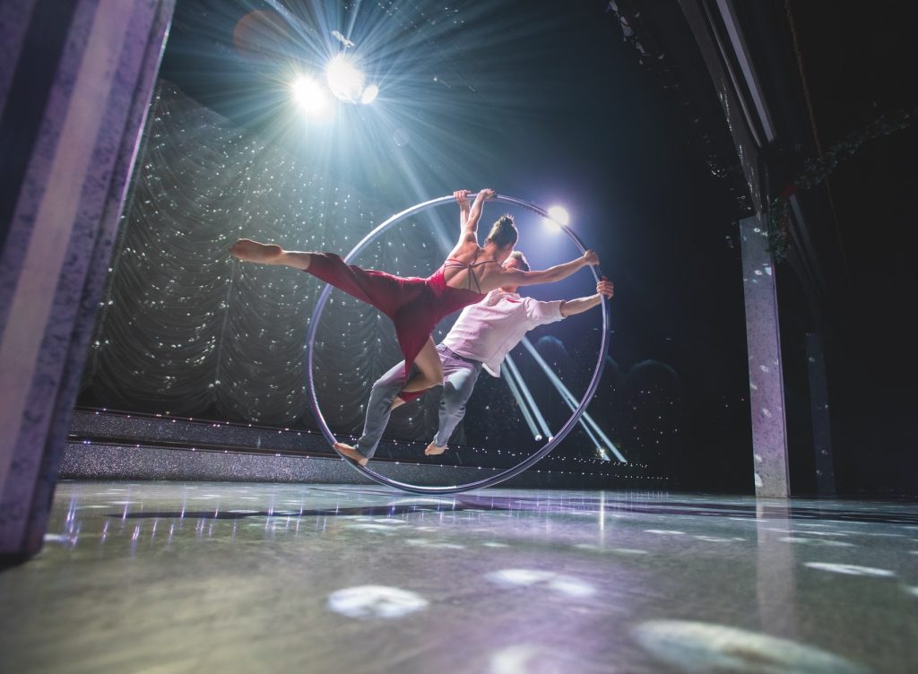 The dancers’ synchronicity and spirit is – as always – on point, whether they’re performing the poker-straight Toy Soldier Routine (made famous by The Rockettes), Irish jigging or tap dancing dressed as Father Christmas. The speciality acts are the best I’ve seen yet, from skipping quartet Centripetal Forces (the energy!) to German acrobats Duo LéOlé, pictured below, to handbalancer Vladislav Khvostik.