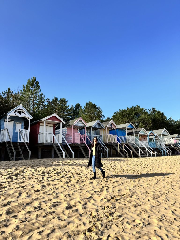 Wrap up for a bracing walk along the sweeping sandy beach, often quieter in winter but no less beautiful. Wide sands, big skies and colourful beach huts create a striking scene, and some huts can still be hired in the colder months, giving you a cosy base to shelter from the wind, warm up with a hot drink and enjoy the views. Note, always be aware of an incoming tide and local hazards – seek reliable local knowledge if you are at all unsure.